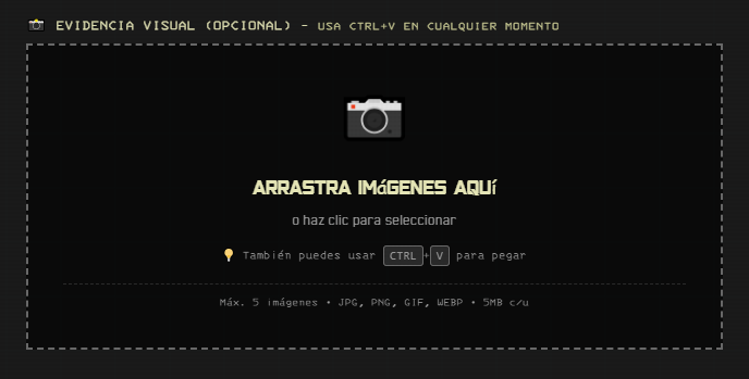Un reporte con pruebas tiene más peso. En la sección final, puedes pegar capturas de pantalla o links de videos que demuestren la falta. Solo presiona CTRL+V en el área indicada para subir tu imagen.