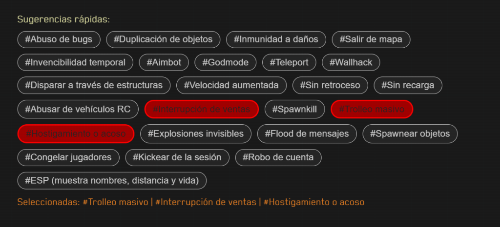 #Trolleo masivo#Interrupción de ventas#Hostigamiento o acoso#Godmode, etc.