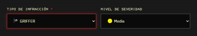 - Tipo de Infracción y Gravedad: Selecciona si es un Griffer, Modder o Tramposo y qué tan grave fue la falta.
