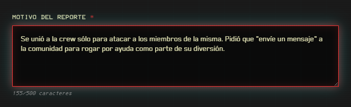 - Motivo del reporte: Explica brevemente qué sucedió. Sé específico (ej. “Se unió a la crew solo para atacar a los miembros”).