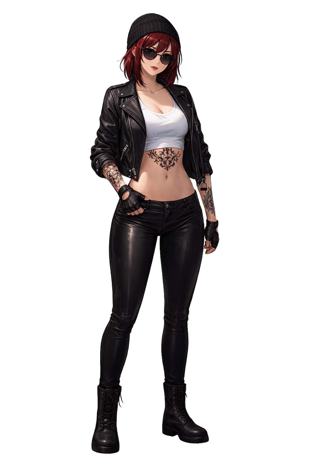 Outfit: Athletic yet curvy body type. Visible black tribal tattoo centered on the lower abdomen. Additional tattoos on both arms (stylized black ink designs). Black fingerless tactical gloves. Black leather motorcycle jacket, slightly open. Underneath, a tight white cropped tank top exposing the midriff. Tight black leather pants with realistic leather texture and reflections. Black combat boots with visible laces and solid structure.