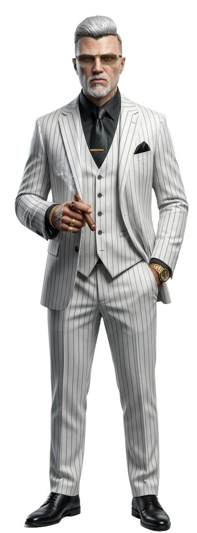 Outfit: Dresses in a clean white mafia-style suit that reflects power and control. The outfit is simple but elegant: White jacket, Matching vest, White pants, Dark shirt and tie for contrast, Pocket square and tie bar, Luxury watch and rings. The style makes him stand out in any room, like a silent leader who commands respect without speaking.