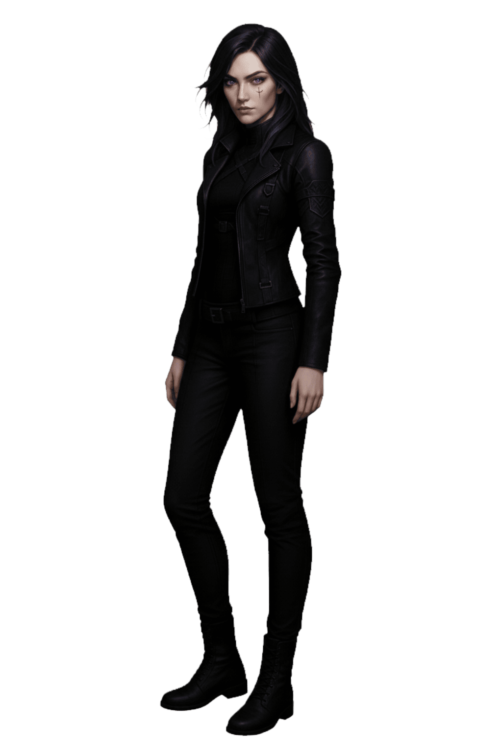 Outfit: Gothic black leather jacket with harnesses, tactical top, and runic gauntlets, blending gothic tech with dark fantasy.